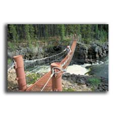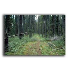 August 11Here we are, three smelly people huddled in a tent, the mosquitoes banging themselves against the tent! (it sounds like rain) Their hum sounds like B29s in the distance. We hiked as near as we can figure, 25 km today, and it was bloody hard. I have learned my lesson. Flat ground does not equal easy. Flat ground equals swamps and mosquitoes. Flat ground equals dehydration and pain. Mackenzie was a lunatic. We started out fast and hard, and after about 2 hours I reached my limit. Unfortunately, we didn't stop for another eight hours. Significant amounts of trail (and time)were lost in unexpected swamps (thanks to an apparently wet spring and way too many beavers) I would cheerfully kill a beaver right now and throw its carcass in the lake to float and fester, as a lesson to other beavers. Seriously, we had to cross a god-awful swamp today (maybe 100-150m). It was murky, disgusting water, mushy and squishy plants. Oh and mosquitoes. Robert discovered probably the only way to get across was to balance across the beaver dam. I think somebody should tell the Mackenzie people that they don't need to blaze every tree on the good parts of the train, and instead put half-a-dozen bright yellow signs clearly visible across a swamp. I don't know how many bogs and swamps we crossed today. Everybody had an opportunity to get knee deep in mud today. I did it so many times that it hardly mattered whether I found solid ground or not anymore. The high point of the day was the Dean River. We took a 1km detour in order to cross the river over a metal footbridge that was pretty cool. The bottom was a large metal mesh, and the cables on either side were spaced just a bit too widely apart to be useful. Water rushed below between a narrow (30m) space in the rock cliffs. There was a beautiful campsite at the Dean River, and although we took some time to get water and wash up, we had to press on. It was the most agonizing 6km of my life. We plodded on as evening drew close, I was so exhausted that I wept the final miles. Camp was set up and dinner prepared and eaten in record time. There is no breeze and the evening is warm. There are some things to be thankful for: